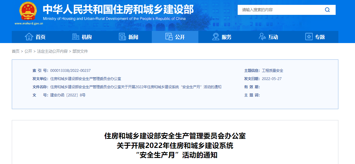 今年6月是第21个全国“安全生产月”,主题是“遵守安全生产法 当好第一责任人”。近日,住房和城乡建设部安全生产管理委员会办公室发布关于开展2022年住房和城乡建设系统“安全生产月”活动的通知。