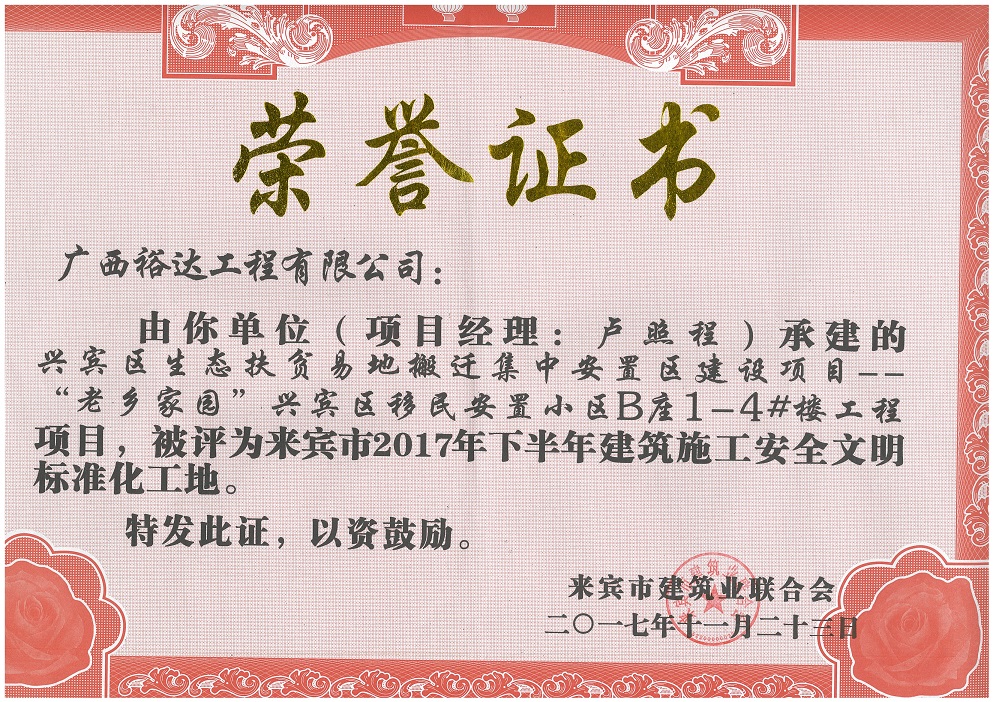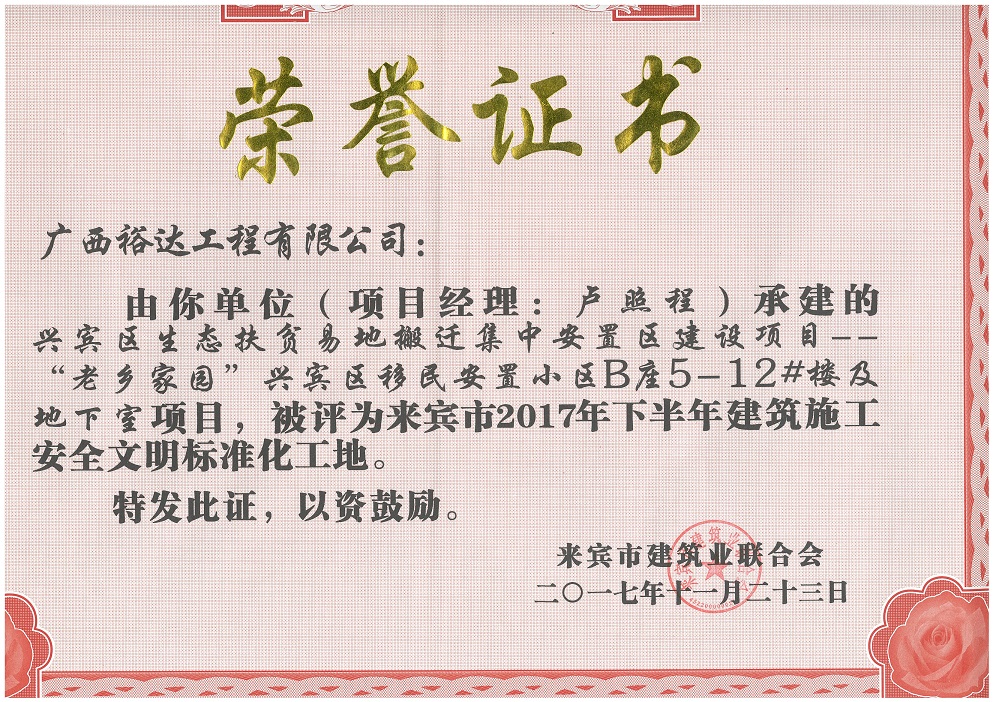 近日,由广西裕达工程有限公司承建的兴宾区生态扶贫易地搬迁集中安置区建设项目—“老乡家园”兴宾区移民安置小区B座1-4#楼、B座5-12#楼及地下室、裕达·金碧天誉A区1#-4#楼及地下室,共3个工地荣获来宾市2017年下半年“安全文明标准化工地”荣誉称号。