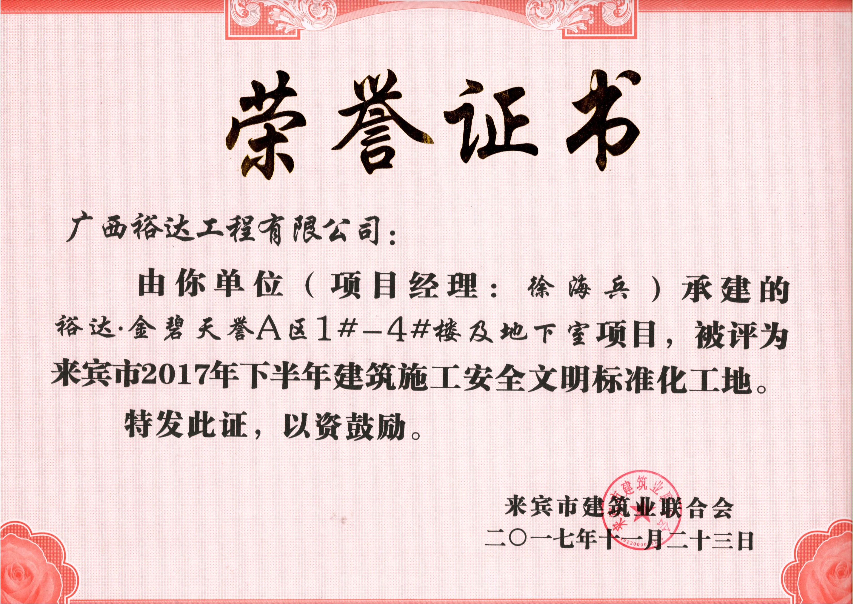 广西裕达工程有限公司再添来宾市“安全文明标准化工地”