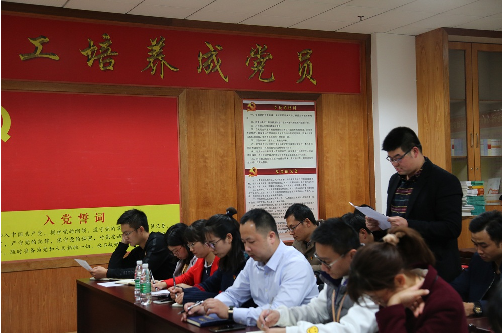 为进一步加强党员队伍建设,吸收新鲜血液,壮大党支部队伍。2018年11月23日下午4点,集团党支部在集团7楼党员活动室召开党员大会,讨论预备党员转正及吸收预备党员事宜。支部27名正式党员、2名预备党员及2名入党积极分子参加本次会议,兴宾区城北街道党工委组织干事潘彩妮、卢玉妮列席会议,大会由支部组织委员、集团人力资源部副经理曾雪菊主持。