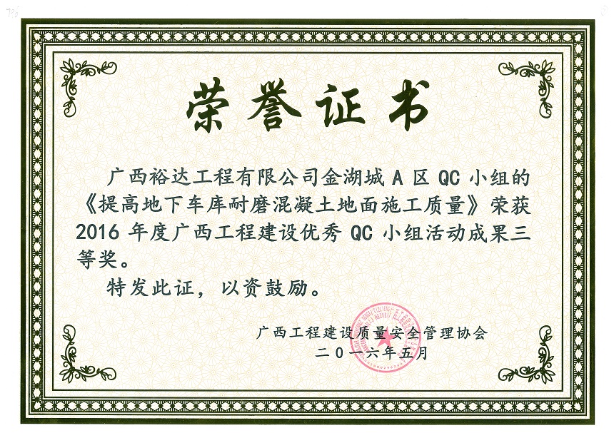 2016年度广西工程建设优秀QC小组活动成果三等奖《提高地下车库耐磨混凝土地面施工质量》-金湖城A区