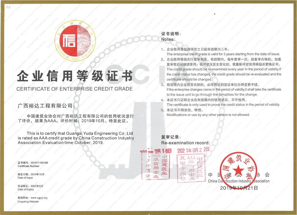 公司2019年获得AAA级信用企业证书。今年信用评级是以各企业2020年度公司诚信经营业绩、质量安全管控情况等为考核期主要评价指标。在考核期内工程公司表现优秀,经评审通过 AAA级复审。这是对公司信誉、实力和形象的肯定,标志着公司在企业信用建设中取得了优异的成绩,公司的素质和诚信度高,各项指标优秀,诚信意识强、经营状况好、履约能力强、社会信誉好,品牌形象已具备一定的市场竞争力。