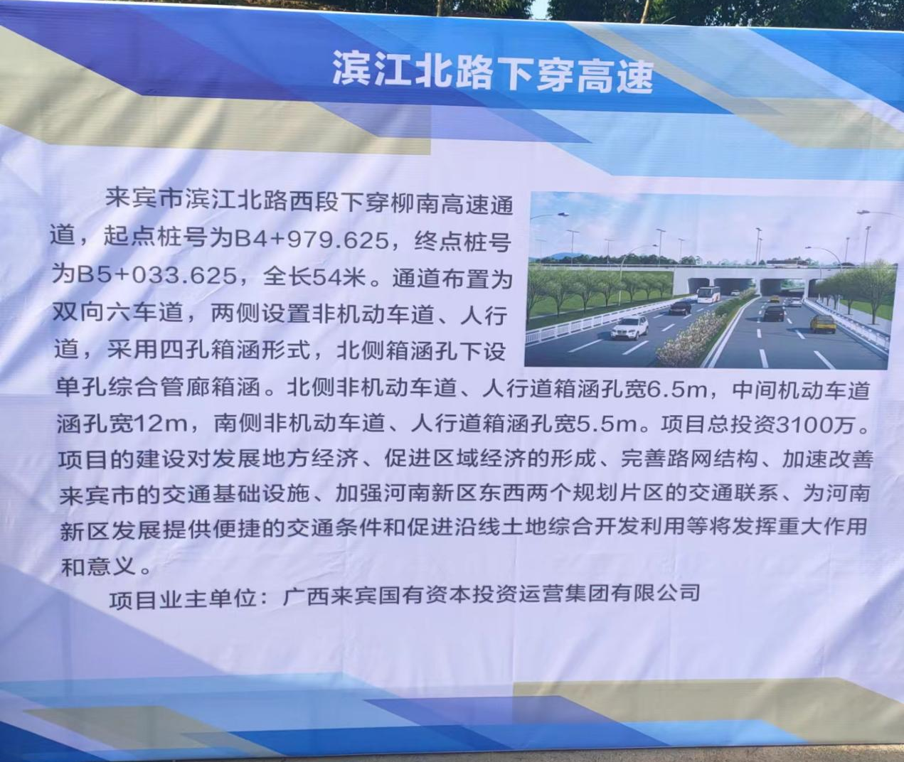 来宾市滨江北路西段下穿柳南高速通道由广西裕达工程有限公司承建,项目全长54米,通道布置为双向六车道,两侧设置非机动车道、人行道。北侧非机动车道、人行道箱涵孔宽6.5m,中间机动车道涵孔宽12m,南侧非机动车道、人行道箱涵孔宽5.5m,项目总投资3100万。项目建成后,将有效缓解这一路段的交通拥堵问题,使附居民上班、上学出行更为安全便利。同时,项目建设能进一步加强来宾河南东西两个片区交通联系,促进沿线土地综合开发利用,提高市场价值。接下来,工程公司将认真按照有关要求抓好项目建设,做好工程质量保障、安全保障,并加快建设进度,确保项目按时按质早日建成。