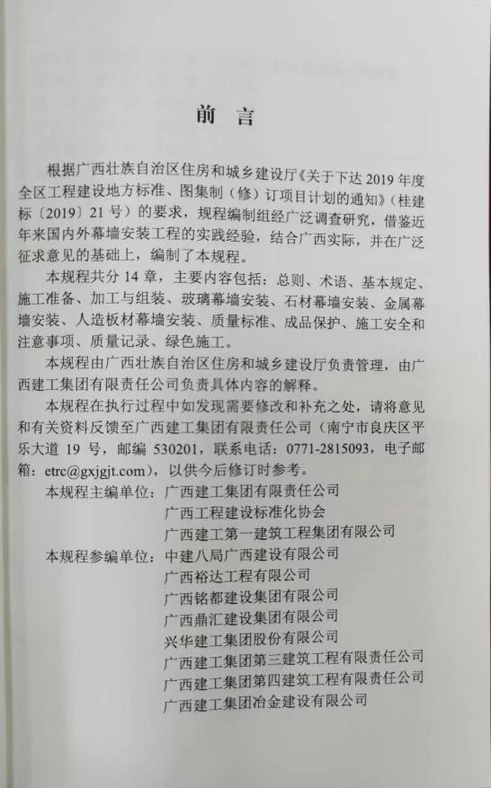 据悉,《幕墙安装工程施工工艺规程》由广西建工集团有限责任公司、广西工程建设标准化协会、广西建工第一建筑工程集团有限公司主编,中建八局广西建设有限公司、广西裕达工程有限公司等共8家公司参编,共分为14个章节,内容包括总则、术语、基本规定、施工准备、加工与组装、玻璃幕墙安装、石材幕墙安装、质量标准、施工安全和注意事项、绿色施工等。该标准规范和指导了幕墙安装、屋面工程的施工工艺,推动了幕墙安装、屋面工程的标准化与规范化的进一步发展,填补了广西幕墙安装工程施工工艺规程的空白,对广西幕墙安装工程施工工艺规范的高质量发展有重要指导意义。
