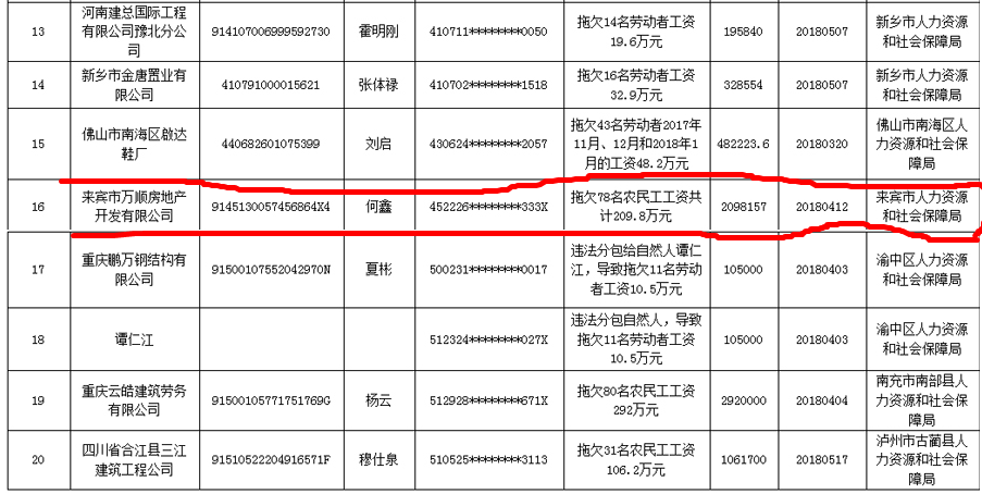 建立和实施拖欠农民工工资“黑名单”制度,加大对拖欠工资违法失信行为的惩戒力度,是保障农民工工资支付的一项重要举措,是推进企业工资支付诚信体系建设的重要内容,也是健全源头预防、动态监管和失信惩戒相结合的工资支付制度保障体系的重要手段。为此,2017年9月,我部专门制定印发了《拖欠农民工工资“黑名单”管理暂行办法》,于今年1月1日起施行。2017年11月,我部又与发展改革委、人民银行、住房城乡建设部等30个部门和单位联合签署印发了《关于对严重拖欠农民工工资用人单位及其有关人员开展联合惩戒的合作备忘录》。各地人社部门结合本地实际,制定出台相关实施细则,依法开展拖欠农民工工资“黑名单”认定工作,并实行跨部门联合惩戒。近期,我们在各地提供情况的基础上,梳理了第一批拖欠农民工工资“黑名单”,共涉及14家违法企业和6名违法人员,今天在此将这些违法企业和个人向全社会予以公布。