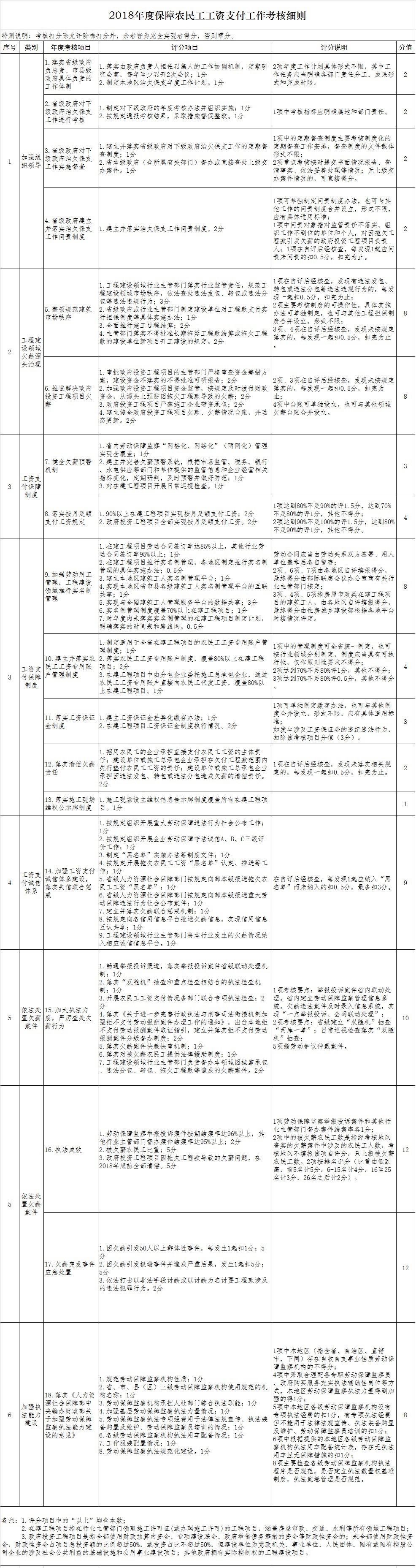 据部际联席会议办公室负责人介绍,今年的《考核细则》共有考核指标65项,分为加强组织领导、工程建设领域欠薪源头治理、工资支付保障制度、工资支付诚信体系、依法处置欠薪案件和加强执法能力建设等5个方面。《考核细则》将继续坚持目标导向、问题导向和结果导向,突出年度考核重点,注重考察治理欠薪实效。根据2017年度考核实施情况并结合各地区保障农民工工资支付工作形势,部际联席会议在《考核细则》中,重点加强了对落实主管部门特别是工程建设行业主管部门责任、强化对欠薪失信企业信用惩戒以及推进落实工资支付保障制度的考核力度,加大相关项目的分值权重,充分发挥考核的正向导向作用,指导和督促各地区严格落实属地监管责任,确保党中央、国务院的关于保障农民工工资支付的各项工作部署能够真正落实落地。