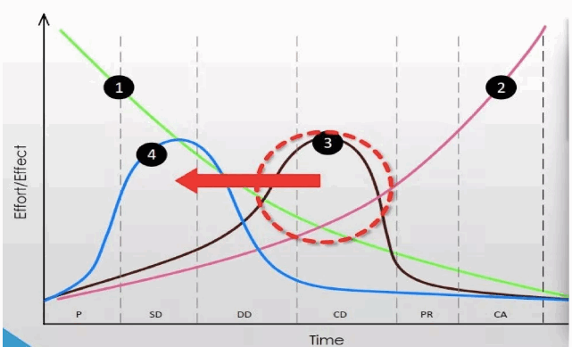 在麦克利米曲线图中,横轴代表时间,纵轴表示努力/成果。曲线1代表影响成本和功能特性的能力随着阶段的进行而逐渐走弱,曲线2代表设计变更的费用随着阶段的推进而逐步增多。曲线3代表着我们当前传统的设计过程,即在扩初设计及施工图阶段进行大量设计变更,而曲线4则代表最优选的设计过程,即大多数设计在设计前期及方案设计中完成,完成于扩初设计阶段。而世界建筑业的主流的变更轨迹,正是从曲线3向曲线4的过渡。