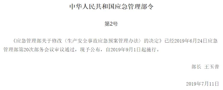 7月11日,应急管理部发布“中华人民共和国应急管理部令第2号”:《应急管理部关于修改〈生产安全事故应急预案管理办法〉的决定》(下面简称《决定》)已经2019年6月24日应急管理部第20次部务会议审议通过,自2019年9月1日起施行