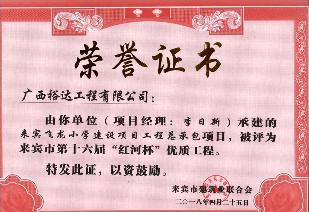 2018年来宾市第十六届“红河杯”优质工程(裕达·金碧天誉B区18#楼项目)