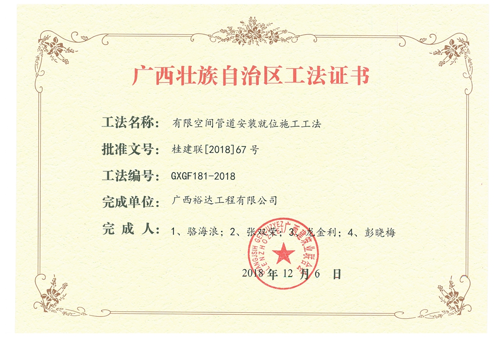 2018年广西壮族自治区工法证书(有限空间管道安装就位施工工法)