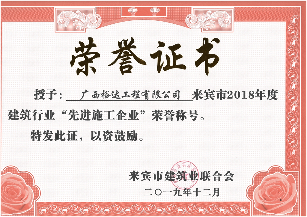 来宾市2018年度建筑行业“先进施工企业”